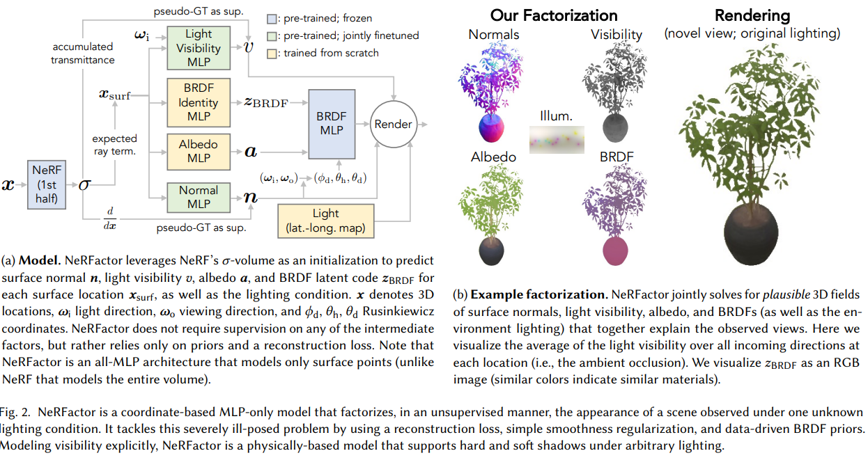 NeRFactor는 svbrdf, shape 등을 mlp를 이용해 set of observed input view를 만족하는 방향으로 continuous 한 3D field로 표현한다.